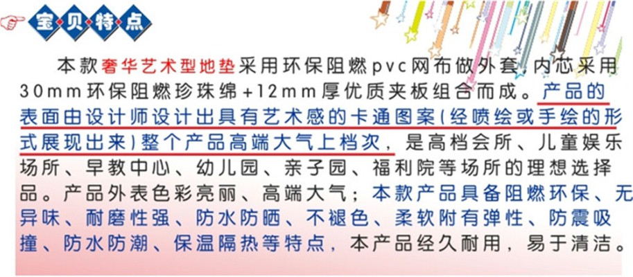 说明:本系列产品采用进口阻燃PVC,阻燃高密度海绵软体材料制造,阻燃标准达到英国防火标准BS7176标准,色彩鲜艳、光滑柔软、不易破损、弹性良好、安全耐用。在玩耍中锻炼小朋友的身体功能